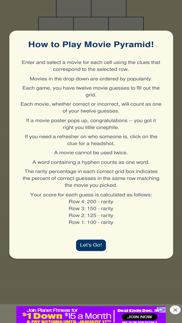 how well do you know movies? movie pyramid is a daily trivia game where you use the clues to pick a movie for each spot on the board. come back every day for a new puzzle!