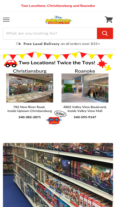 Largest Toy Store in all of Southwest Virginia, serving Christiansburg, Blacksburg, Radford, Roanoke and Salem, Virginia. Featuring LEGO, R/C Cars and Trucks, two stores: Valley View Mall, New River Valley Mall, named as a "Things to Do" in Christiansburg, Mattel, Fisher-Price, Melissa & Doug, Traxxas, R/C Car parts
