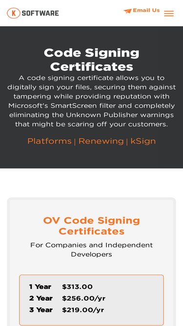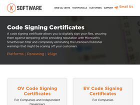 k software offers discount microsoft authenticode, website certification authority, and code signing certificates. download the free ksign code signing software and eliminate unknown publisher warnings on your downloads.