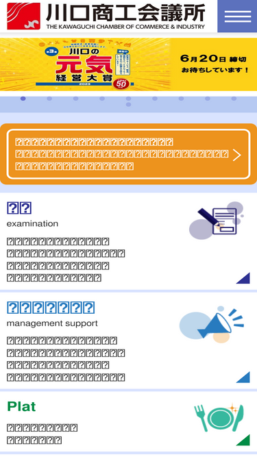 85%埼玉県の川口商工会議所公式サイト。融資、経営相談など、働く方の力になります。共済や各種保険でもしもの時のサポートも。簿記、販売士、珠算などの各種検定。会報誌「move」、駅前大型ビジョン「キャスティビジョン」を使用した会員さま限定の幅広い無料広報ツールが自慢です。