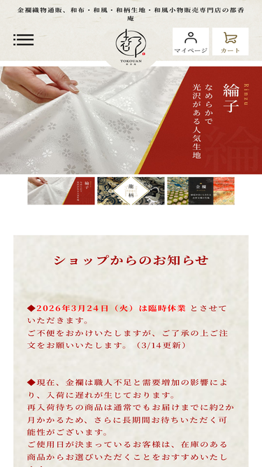 和布・和風生地・和風小物の通販なら都香庵にお任せください。専門店がおおくりする“金襴生地”“金彩友禅”“正絹錦裂”“和柄生地のはぎれ”やお得なセット生地などの販売をしています。