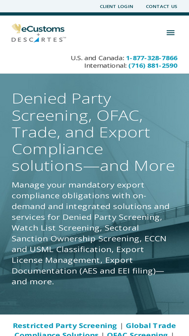 eCustoms: your source for export compliance solutions, including Denied Party Screening, Restricted Party Screening, SDN checks, ECCN/USML Classification, Export Documentation/AES, License Management (SNAP-R/D-TRADE), and NAFTA.