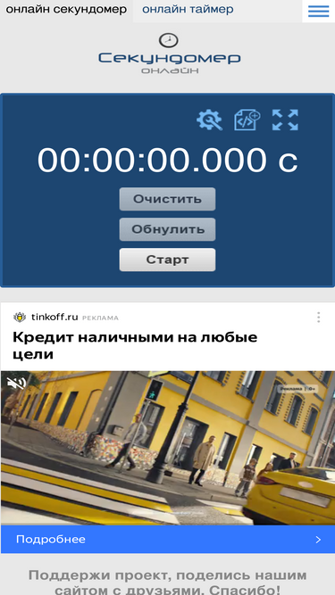 100%Онлайн секундомер отсчитывает время с точностью до миллисекунды после нажатия кнопки Старт. Позволяет добавлять круги. Сохраняет показания секундомера и кругов после закрытия. При больших значениях отображает прошедшие дни.