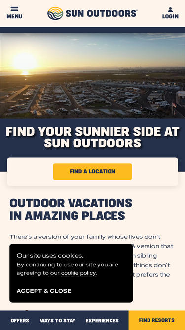 100%find your sunnier side at resorts with rv & tent camping sites, vacation rentals and homes with fantastic amenities in amazing places across the us and ontario.