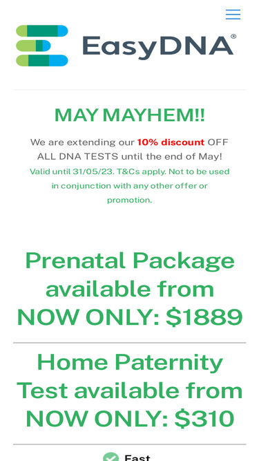 82%EasyDNA can now offer the most comprehensive non-invasive prenatal genetic screening test available – Our ‘Prenatal Peace’ (also called NIFTY™) test is a 100% safe test that screens for Down’s syndrome and 17 other genetic conditions. Starting at just 10 weeks of pregnancy and using only a maternal blood sample.