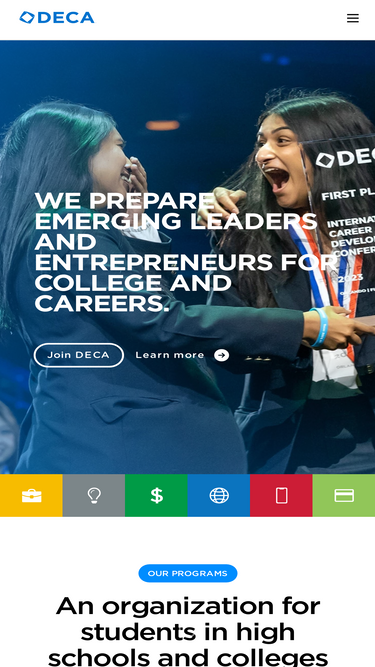 98%DECA prepares emerging leaders and entrepreneurs for careers in marketing, finance, hospitality and management in high schools and colleges around the globe.