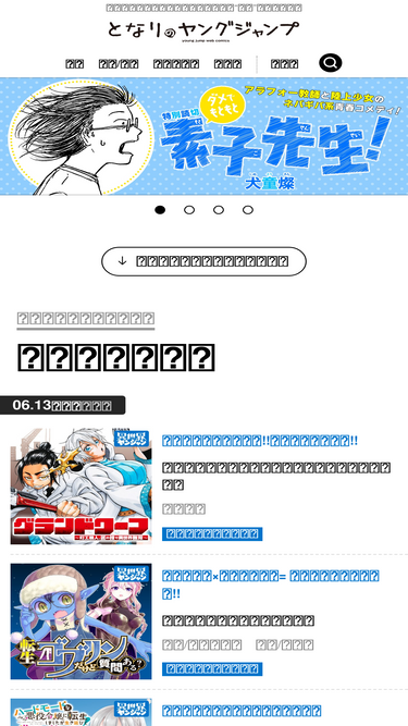 となりのヤングジャンプについて スマートフォンの普及以来、 漫画は通勤通学はもちろんのこと、 お風呂で、トイレで、ベッドの中で、 メールやSNS、ゲームの合間に、 あらゆる時と場所のスキマで楽しめるものになってきました。 ふっと気を抜くそのひと時に、 いやなことがあったその時に、 “となりにいてほしい”キャラとの出会いを提案する。 それが“となりのヤングジャンプ”のテーマです。 頑張れ! だけではなく、たまにはサボれ! と言ってくれる存在。 成長しろ! だけでなく、そのままの君もいい! と言ってくれる存在。 そして …! 圧倒的な力で代わりに強敵を粉砕してくれる存在。 そんなキャラクターたちの…