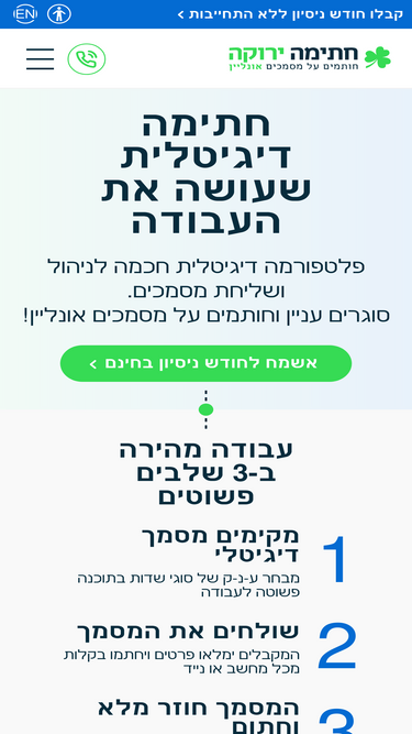 חתימה דיגיטלית על מסמך - מאובטחת ותקינה ע"פ החוק בישראל! ממשק סופר ידידותי. מציגים לממלא הטופס רק את השדות שנדרשים לו. מותאם לניידים. לפרטים >