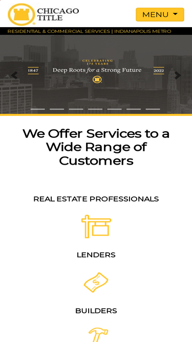 92%Chicago Title Indianapolis Metro. We provide residential real estate services including: Title Insurance, Closing and Escrow services, Construction Disbursing, 1031 Property Exchanges and more.