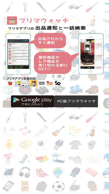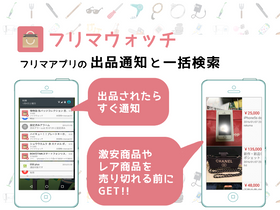 100%フリマアプリの出品を通知し、気になる商品の素早い購入を支援します。メルカリやフリルなど多数のフリマアプリに対応。