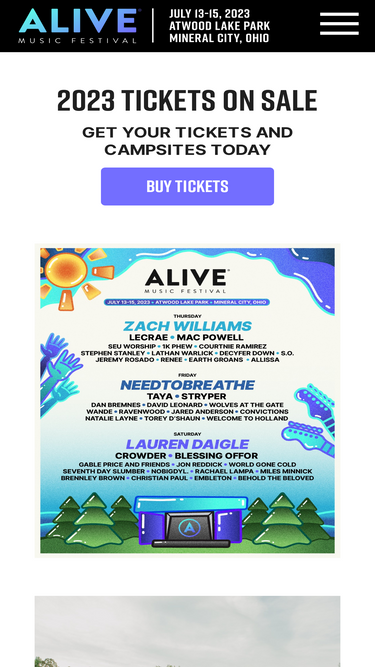 Alive is a 3-day music festival with multiple stages, 40+ artists, beautiful camping and RV sites, a 1,500-acre lake, tasty food and drink options, VIP experiences, late night comedy, and so much more. Alive takes place July 18-20, 2024 at Atwood Lake Park in Mineral City, OH.