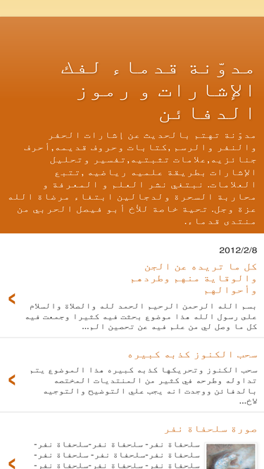 مدوّنة تهتم بالحديث عن إشارات الحفر والنفر والرسم ,كتابات وحروف قديمه,أحرف جنائزيه,علامات تثبتيه,تفسير وتحليل الإشارات بطريقة علميه رياضيه ,تتبع العلامات. نبتغي نشر العلم و المعرفة و محاربة السحرة ولدجالين ابتغاء مرضاة الله عزة وجل. تحية خاصة للأخ أبو فيصل الحربي من منتدى قدماء.