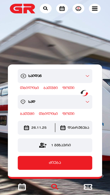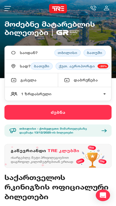 Find and book train tickets from Tbilisi to Zugdidi on tre.ge . Compare prices, schedules, and availability for trains between these cities. Plan your journey and reserve your seats online.