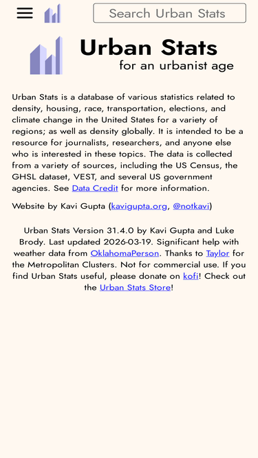 Urban Stats is a database of statistics related to density, housing, race, transportation, elections, and climate change.