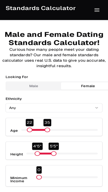 Find out how many people meet your dating standards. Use our male & female standards calculator based on real US Census & NCHS data.