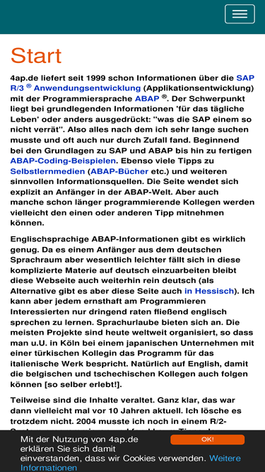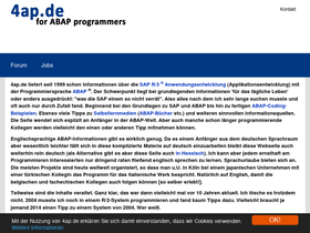 4ap.de liefert seit über 10 jahren schon informationen über die sap r/3 © anwendungsentwicklung (applikationsentwicklung) mit der programmiersprache abap © . der schwerpunkt liegt bei grundlegenden informationen 'für das tägliche leben' oder anders ausgedrückt: "was die sap einem so nicht verrät". also alles nach dem ich sehr lange suchen musste und oft auch nur durch zufall fand. beginnend bei den grundlagen zu sap und abap bis hin zu fertigen abap-coding-beispielen. ebenso viele tipps zu selbstlernmedien (abap-bücher etc.) und weiteren sinnvollen informationsquellen. die seite wendet sich explizit an anfänger in der abap-welt. aber auch manche schon länger programmierende kollegen werden vielleicht den einen oder anderen tipp mitnehmen können.