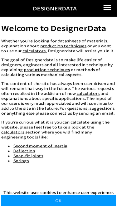 whether you're looking for datasheets of materials, explanation about production techniques or you want to use our calculators, designerdata will assist you in it.the goal of designerdata is to make life easier of designers, engineers and all interested in technique by explaining production techniques or methods of calculating various mechanical aspects.