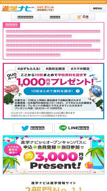 進学ナビは、全国の専門学校・短大・大学のオープンキャンパス開催情報、奨学金、学費、評判などの最新情報を掲載しています!資料請求やオープンキャンパス申込もできる、高校生の為の進学情報サイトです。QUOカード等プレゼントキャンペーン実施中!