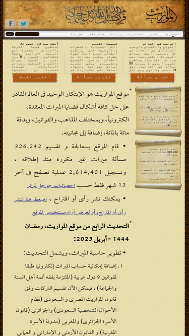 موقع المواريث هو برنامج حساب المواريث إلكترونيا بدون تحميل، حساب وفق 5 مذاهب و 9 قوانين عربية، حاسبه الورث لتقسيم الميراث الشرعى و توزيع الورث و قسمة التركة على القرآن والسنة، و أسهل طريقة تقسيم ميراث الوصية الواجبة وتكوين مسائل عشوائية مع الحل، هو برنامج لحساب الارث، تقسيم ورث الزوجة والبنات والاولاد