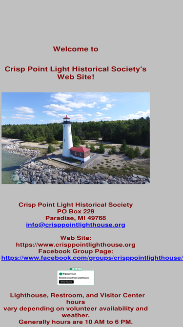 25%this site is about the crisp point lighthouse, located about 13 miles west of whitefish point on lake superior's southern shore in the upper peninsula of michigan. this site is maintained by cameron lovett of the crisp point light historical society.
