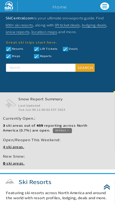 72%ski resort guide and directory for ski resorts across north america. features resort profiles, mountain statistics, ski reports, resort lodging, location maps, trail maps, directions, lift ticket deals, ski vacation packages and more.