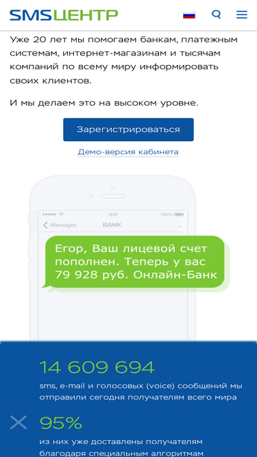 93%удобный стабильный сервис для смс-рассылок по всему миру, доступные цены, гибкие тарифы, прием и обработка входящих sms-сообщений, ems и бинарные sms, e-mail2sms, hlr, mms, voice, e-mail рассылки, api по smpp/http/smtp протоколам. бесплатное тестирование.