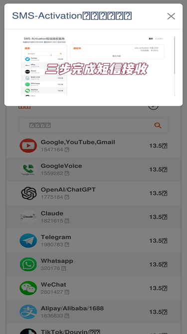 sms-activation在线短信接码平台,提供海量临时虚拟手机号码,覆盖全球188个国家和地区,支持telegram/google/openai/claude/wechat/alipay/tiktok/redbook等各种服务 | receive sms