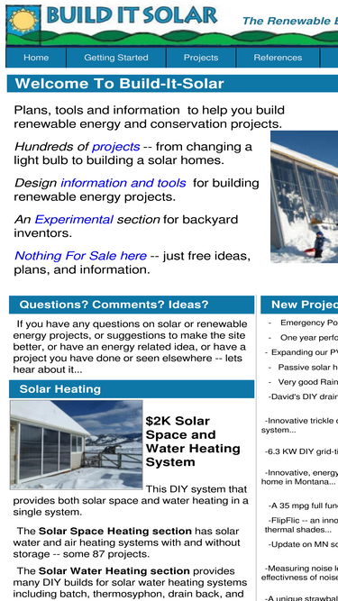 build it solar will help people with do it yourself skills build solar projects that save money and reduce pollution. it is a "hands-on" site with detailed plans for solar projects including solar space heating, water heating, passive solar home design, solar pool heating, solar cooking, photovoltiacs, wind generators, and others.