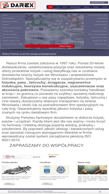 91%firma darex z wrocławia oferuje zaopatrzenie przemysłu w łożyska,pasy, uszczelniacze oraz akcesoria pokrewne. zapewniamy wysokiej jakości łożyska znanych na rynku europejskim firm. posiadamy szerokie kontakty handlowe w kraju i za granicą.