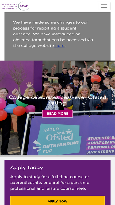 95%apply for september now at bcot.ac.uk. basingstoke college of technology is a further education college in basingstoke, hampshire offering vocational qualifications through full-time and part-time courses, as well as apprenticeships.
