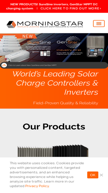 Morningstar manufactures and supplies solar charge controllers and inverters. Over 4,000,000 off-grid solar products deployed globally since 1993.