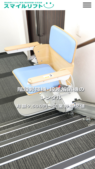 97%階段昇降機や段差解消機を中心に、スマイルケアでは移動用リフトなどの福祉用具・介護用品の販売・レンタルを行っております。また、階段昇降機の試乗や展示もご用意しております。階段昇降機・段差解消機のことならスマイルケアにお任せください。