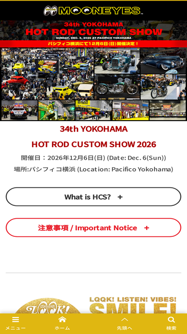 YOKOHAMA HOT ROD CUSTOM SHOW (以下 HCS) とは MOONEYES が主催する日本最大級のインドア Car & Motorcycle Show。日本国内はもちろん世界中で注目を集める Motor Showです。さらに海外のビルダーとそのビルダーが製作した車両がゲストとして来日し、一日楽しめるスワップミート、ライブバンド、ペイントコンテストなどなど楽しい企画が満載のイベントです。 YOKOHAMA HOT ROD CUSTOM SHOW, organized by MOONEYES, is the largest indoor custom car and motorcycle show in Japan. It's also one of the most popular events worldwide with visitors from all over the world. The event features guest and builders from all over the world., swap meet and vendor spaces, live bands, custom paint contest, pinstripers and so much more wrapped up in a one-day show.