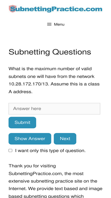 100%The most extensive subnetting practice site on the Internet. The best place to practice for your networking career and the CCNA and Network+.