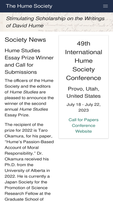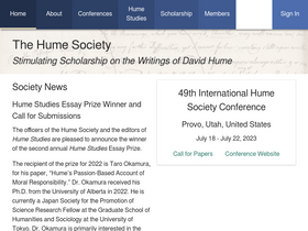 the hume society is an international organization of scholars whose purpose is to stimulate scholarship on all aspects of the thought and writings of david hume, the 18th-century scottish philosopher, historian and essayist. membership in the society is open to everyone interested in hume and his philosophical and literary contemporaries.