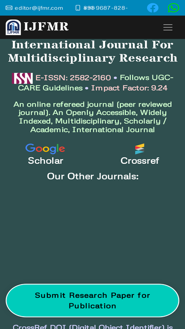 89%ijfmr is an online refereed journal, refereed also means peer reviewed. ugc (india) recommends publishing papers in refereed journals or in the journals listed in ugc-care. it is an openly accessible, multidisciplinary, scholarly / academic, international journal published bi-monthly. we are accepting research work for publishing in all research areas/disciplines. the research work published in our journal is submitted to various research indexing websites and databases.