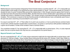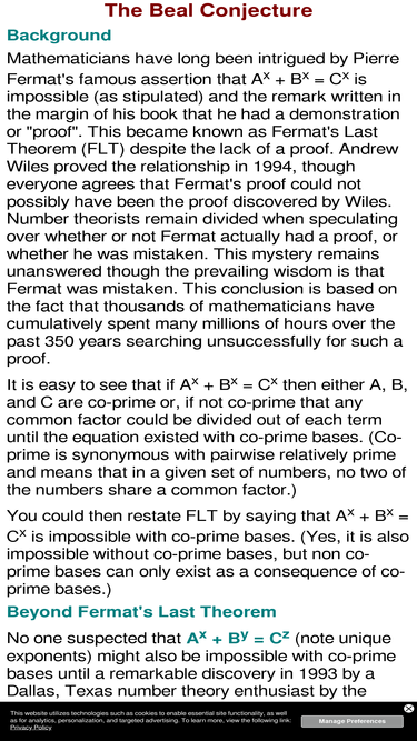 the beal conjecture - number theory enthusiast andy beal postulates that a^x+b^y=c^z is impossible with co-prime bases. a us$1,000,000 prize is offered for a rigorous proof or disproof of the beal conjecture.