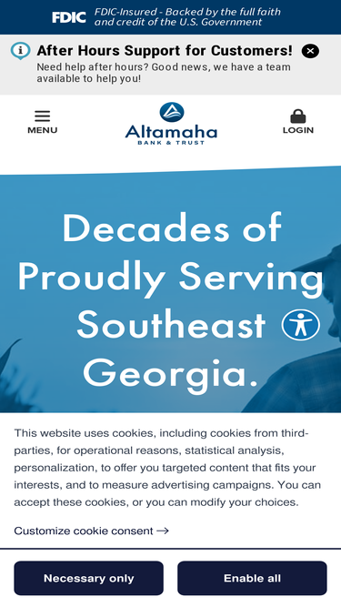 99%the mission of altamaha bank and trust is to grow and enhance the long-term return of our shareholders' investment by offering high quality banking services and exceptional customer service to the communities we serve.