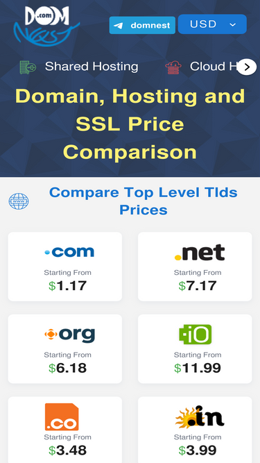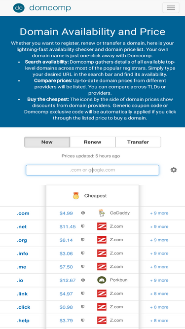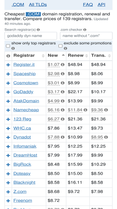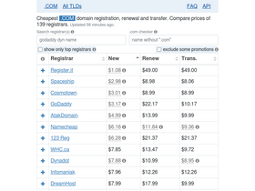 82%cheapest .com domain registration $2.88, renewal $7.99, transfer $5.99. compare prices of 139 registrars. prices are updated every hour.