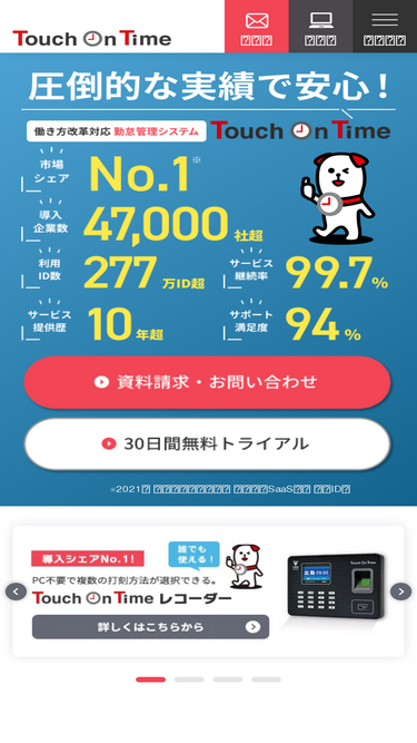 勤怠管理に関する各種資料の無料ダウンロード・お申込ページはこちら。人事労務リスク 回避ハンドブック。タイムカード管理からの脱却。勤怠管理システムの選び方ハンドブック。お客様アンケート タッチオンタイムを選んだ理由とは?タッチオンタイム お客様導入事例集など。