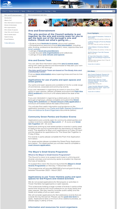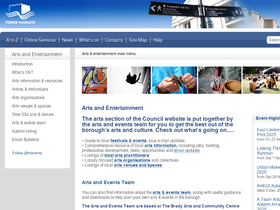 council arts events and information service for tower hamlets and east london with venues; arts directory with artists and organisations; information including jobs, grants, professional development, news and opportunities; local events and entertainment; over 50s arts and leisure; arts and events e-newsletters; and council arts team provision.