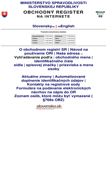 obchodný register slovenskej republiky na internete - hlavná stránka.