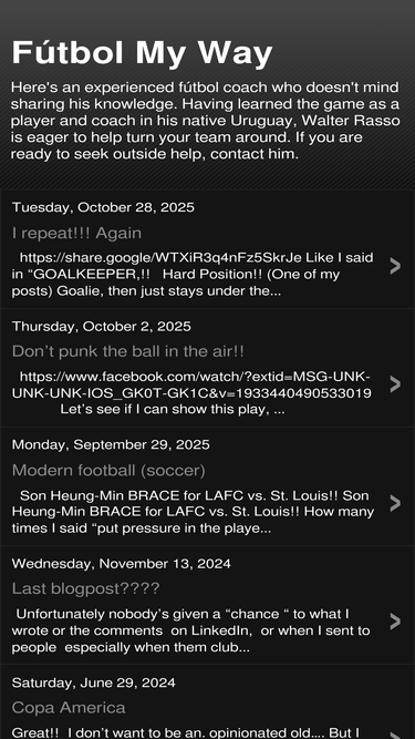 here's an experienced fútbol coach who doesn't mind sharing his knowledge. having learned the game as a player and coach in his native uruguay, walter rasso is eager to help turn your team around. if you are ready to seek outside help, contact him.