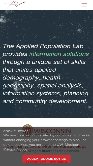 the applied population lab provides information solutions through a unique set of skills that unites applied demography, health geography, spatial analysis, information systems, planning, and community development.