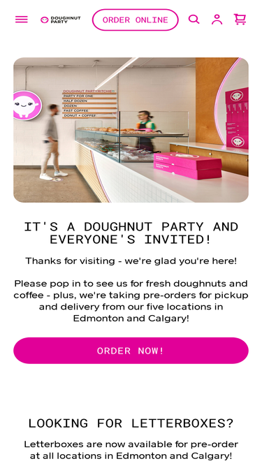 Doughnut Party is an artisanal bakery in Edmonton, Alberta, selling fresh coffee and gourmet donuts.