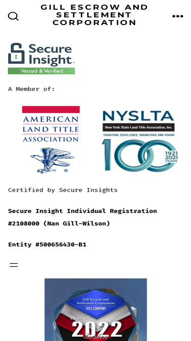 A Member of: Certified by Secure Insights Secure Insight Individual Registration #2108000 (Nan Gill-Wilson) Entity #500656430-B1 Testimonials“Your wisdom and expertise in this matter is forever appreciated” -KOI want to thank you again for your assistance with the purchase of my apartment! Your knowledge and responsiveness, in particular really stood out. -AC Download Forms Mortgage CalculatorEndorsements