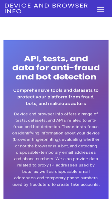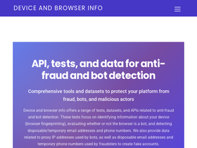 83%device and browser info offers a range of tests (browser fingerprinting), datasets, and apis related to (anti) fraud and bot detection.