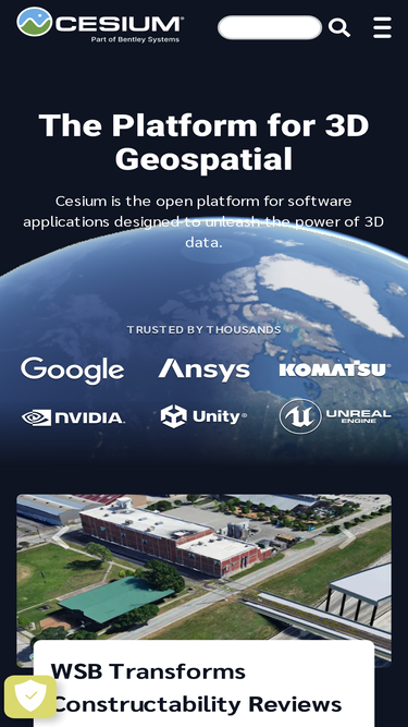 The Cesium platform provides the foundations any software application needs to utilize 3D geospatial data: visualization, data pipelines, curated data, and analytics. Based on open standards for data formats, open APIs for customization and integration, and built with an open source core, Cesium is open, interoperable, and incredibly precise.