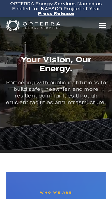 92%Discover OPTERRA's innovative solutions in energy efficiency,infrastructure modernization,and renewable energy.Opterra energy solutions partner supporting public institutions with innovative,cost-effective infrastructure and energy programs. Explore our 50+ years of expertise serving education,government,healthcare,and special districts with comprehensive solutions that build safer,healthier,and more resilient communities.