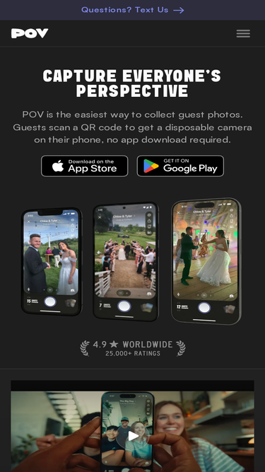 No app download necessary! POV is the modern disposable camera for weddings: guests scan a QR code to capture and share photos your photographer might miss.